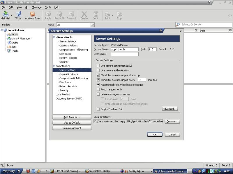 U Ms Outlook sam podesio svoj acount antepapic@st.t-com.hr i tu sve radi ok ali posto sam presao na Mozilla Thunderbird tu sam uradio tools/import i importirao adress book, mail i settings i kad se spojim i hocu skinuti postu (get mail) nakon desetak sekunda se pojavi poruka: "Sending of pasword did not succeed. Mail server pop.htnet.hr responded: Pasword supplied for "papic" is incorrect. Pomozite u cemu je problem. |