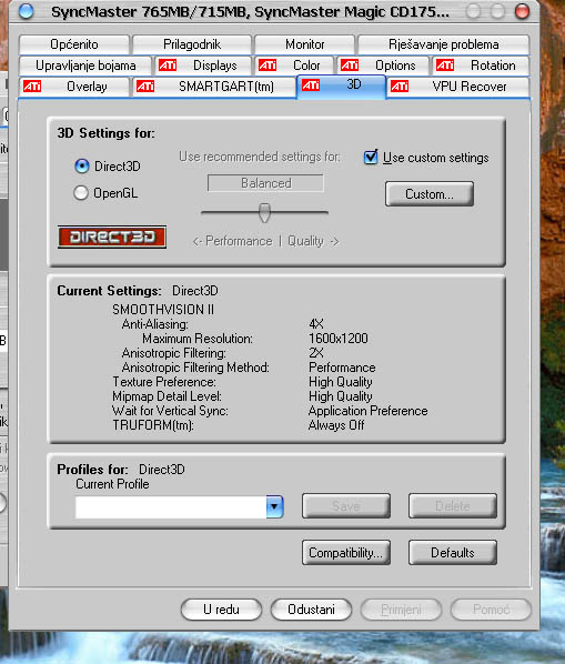 truform=beskorisno....Catalysti 5.9 i noviji više nemaju taj seting uopće... Vsync...zavisi koliko ti je stroj jak i koliki ti je refresh monitora....preporučam isključiti |
