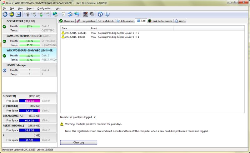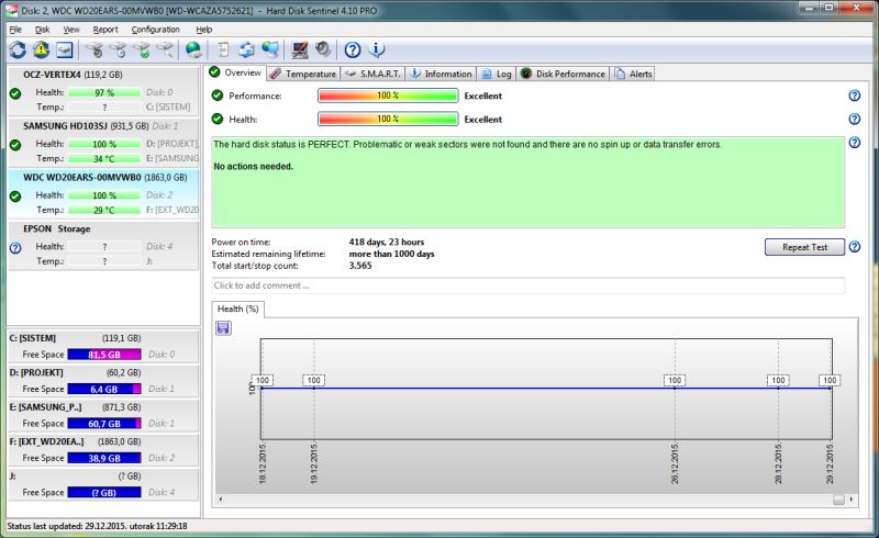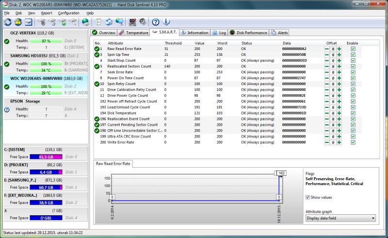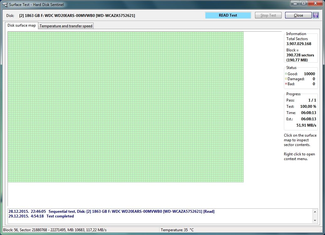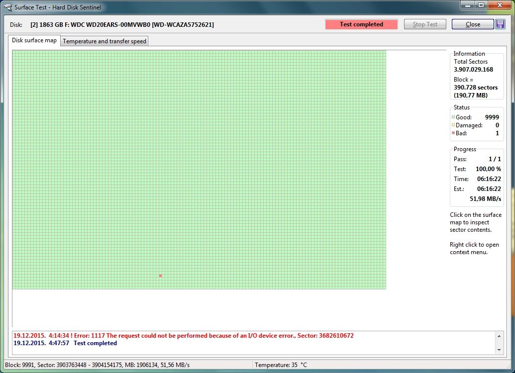 Poštovani, Imao sam problem sa hard diskom WD20EARS, ili imam još, neznam, tu tražim vašu pomoć. Dakle kod čitanja jednog file-a počeli su problemi, konkretno vraćao sam backup sistema i program bi u jednom trenutku prekidao i javljao neku grešku.Digao sam drugi backup sa istog diska i to je prošlo, neispravan file sam izbrisao. Navečer sam pokrenuo hard disk sentinel test i u jutro sam vidio da je pronašao jedan bad sector (slika1). Poslije sledećeg botanja windowsa sam se pokrenuo chech disc i poslije toga sve radi normalno, ponovo sam pokrenuo hard disk sentinel test i on više ne nalazi bad sector, health diska pokazuje 100%(slika 2). HDD je star 4 god.i nema garanciju, dakle pitanje je dali je dotični bad sector samo zaobiđen ili? Tu su još i ostala očitanja log, S.M.A.R.T. i overwiev(slike 3, 4, i 5). |